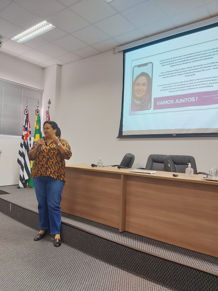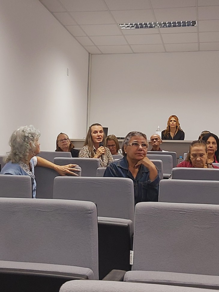Na sequência, foi realizada a palestra "O Direito da Pessoa Idosa e o Conselho Municipal da Pessoa Idosa", ministrada pela Sra. Josiane Pereira de Oliveira, Conselheira Municipal da Pessoa Idosa de Presidente Prudente, em que os presentes participaram ativamente, compartilhando experiências e esclarecendo dúvidas.