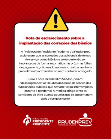 A Prefeitura de Presidente Prudente e a Prudenprev esclarecem que as correções dos adicionais de tempo de serviço, como biênios e sexta-parte vão ser implantadas de forma automática nas próximas folhas de pagamento, não sendo necessário realizar nenhum procedimento administrativo nem contratar advogado. Com a nova lei federal nº226/2026, foram "descongelados"" os 5853 dias do tempo de serviço dos funcionários públicos, que haviam ficado interrompidos durante a pandemia. A medida atinge tanto os servidores da ativa quanto aqueles que se aposentaram após o congelamento.